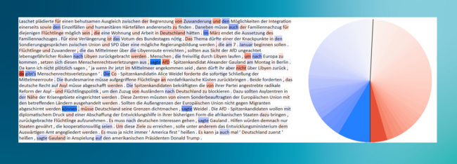 Die Grafiken zeigen anschaulich das Ergebnis: Im ersten Fall sieht man einen Ausschnitt aus einem nachrichtlichen Text aus der Süddeutschen Zeitung mit Markierungen - aufsummiert im Ergebnischart sieht man, dass der blaue Anteil überwiegt. Das Ergebnis: Wahrscheinlich hat ein Mensch diesen Text verfasst.