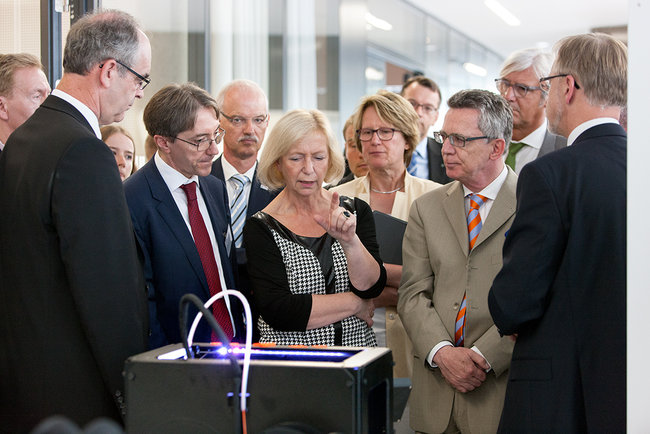 Bundesforschungsministerin Prof. Dr. Johanna Wanka und Bundesinnenminister Dr. Thomas de Maizière informierten sich am 12. August 2015 über aktuelle Forschung und Entwicklungen in der Cybersicherheit. Technische Universität Darmstadt, Hochschule Darmstadt sowie die Fraunhofer-Institute für Sichere Informationstechnologie SIT und Graphische Datenverarbeitung IGD präsentierten in einer Sonderschau Forschungsergebnisse aus der IT-Sicherheit. Die Minister lobten die hervorragende Standortentwicklung und nutzten die Gelegenheit, insbesondere auch mit Nachwuchswissenschaftlerinnen und -wissenschaftlern über die Forschungsbedingungen in Deutschland zu sprechen. Empfangen wurden die Minister vom Präsidenten der Fraunhofer-Gesellschaft Prof. Dr. Reimund Neugebauer, der die essentielle Rolle der IT-Sicherheit für Wirtschaft und Gesellschaft, insbesondere im Kontext von Industrie 4.0, betonte.