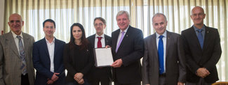 Pressebild 1: V.l.: Danny Dolev, Michael Schapira, Haya Shulman, Michael Waidner, Volker Bouffier, Asher Cohen, Isaiah (Shy) Arkin