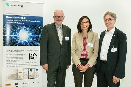 Dr. Michael Meister, Parlamentarischer Staatssekretär des Bundesministeriums für Bildung und Forschung, überreichte heute am Fraunhofer-Institut für Sichere Informationstechnologie SIT den Bewilligungsbescheid für das Projekt QuantumRISC. Das Projekt beschäftigt sich damit, wie in Zukunft eingebettete Systeme – insbesondere im Auto der Zukunft – mittels Kryptografie abgesichert werden können, und dies selbst gegen Angriffe mit Quantencomputern. Die Entwicklung solcher Quantencomputer macht rasante Fortschritte und droht, mittelfristig einen großen Teil der heutigen modernen Kryptografie unsicher zu machen. Projektpartner sind die Continental AG, Elektrobit, die Hochschule RheinMain, die Darmstädter MTG AG, die Ruhr-Universität Bochum, die Technische Universität Darmstadt und das Fraunhofer-Institut für Sichere Informationstechnologie SIT (Leitung). Weitere Informationen zum Projekt finden sich im Internet unter www.sit.fraunhofer.de/quantumrisc .