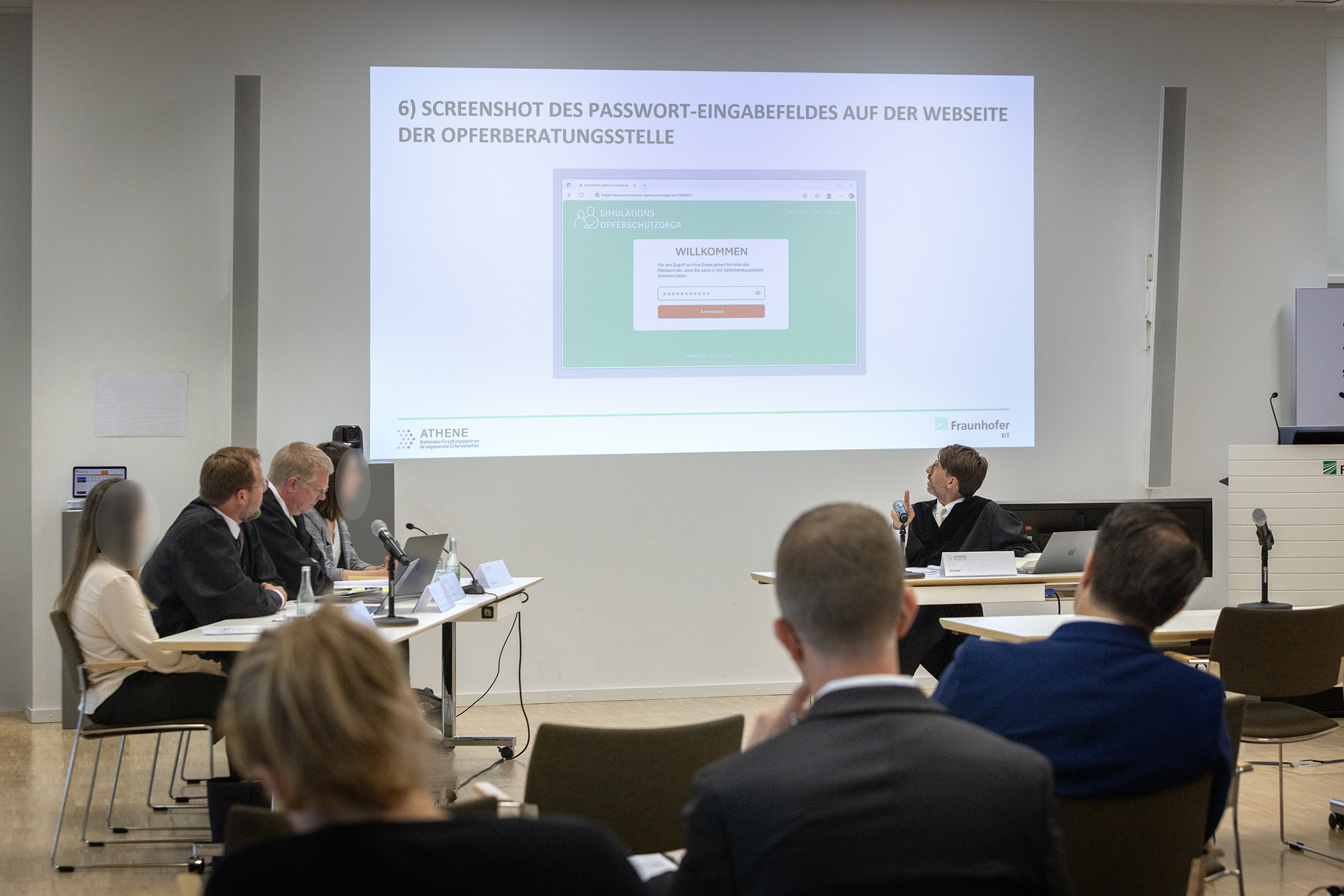 „Aufruf zur Strafsache XX aus Simulationsstadt“, eröffnet der vorsitzende Richter die simulierte Gerichtsverhandlung in Darmstadt. Genauso wie der Staatsanwalt und die beiden Strafverteidiger trägt er eine schwarze Robe – ganz wie im echten Gerichtssaal, nur dass die Verhandlung am Fraunhofer-Institut für Sichere Informationstechnologie in Darmstadt stattfindet. Angeklagt im fiktiven Fall sind zwei Cybersicherheitsforschende, die auf eine Schwachstelle in der Online-Fotoablage einer Beratungsstelle für Opfer von Gewalt aufmerksam geworden sind. Die Anklage lautet auf Verletzung des höchstpersönlichen Lebensbereichs durch Bildaufnahmen sowie Ausspähen von Daten.