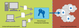 OmniCloud verschlüsselt Daten im Unternehmensnetzwerk, bevor die Informationen in die Cloud wandern. Da der Cloud-Anbieter die kryptografischen Schlüssel nicht besitzt, sind auch sensible Daten in der Cloud sicher vor Wirtschaftsspionen. Gleichzeitig lassen sich mit OmniCloud verschiedene Speicherdienste beliebig kombinieren, und OmniCloud unterstützt auch den Anbieterwechsel. Dadurch können Unternehmen Abhängigkeiten von Cloud-Speicherdiensten vermeiden und bleiben flexibel, um sich etwaige Kostenvorteile zu sichern. Durch automatische Dubletten-Prüfung und Komprimierung sorgt OmniCloud außerdem für eine deutliche Reduzierung der zu speichernden Datenmenge und dadurch für eine Senkung der Cloud-Kosten.