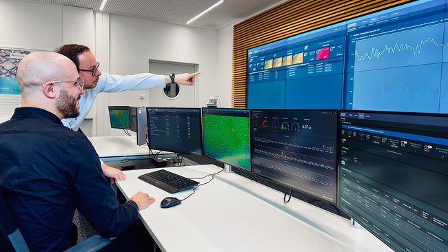 Bildunterschrift: KI-basiertes Schutzsystem für Energiesysteme der Zukunft: Florian Rehwald und Christoph Decker (vorn) greifen über das Dashboard auf das im Project SecDER entwickelte Intrusion-Detection-System zu Foto: Fraunhofer IEE | A. Krolczik