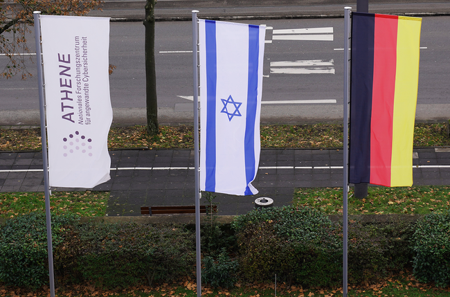 Darmstädter Wissenschaftlerinnen und Wissenschaftler starten Aktion gegen Antisemitismus – Start für Unterschriftenkampagne Zahlreiche Darmstädter Institutionen aus der öffentlichen Verwaltung, Wirtschaft, Wissenschaft und Kultur haben zum 9. November, dem Jahrestag der Reichspogromnacht von 1938, ihre Solidarität mit Israel und den Juden in Deutschland bekundet und ein Zeichen gegen Antisemitismus gesetzt. Auf Initiative des Nationalen Forschungszentrums für angewandte Cybersicherheit ATHENE hissten verschiedene Organisationen die israelische Flagge, brachten Zeichen an Fassaden an oder führten Social-Media-Aktionen durch. Gleichzeitig veröffentlichte ATHENE einen offenen Brief gegen Antisemitismus, dem sich Wissenschaftlerinnen und Wissenschaftler online anschließen können. Brief und Unterzeichnerliste finden sich unter https://www.athene-center.de/nie-wieder.
