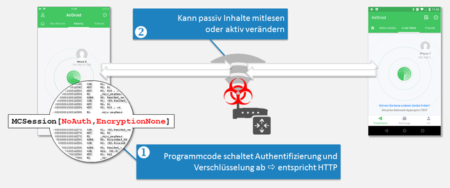 Hier zeigen die Appicaptor Analysen, dass 40% der iOS-Apps mit dieser Funktionalität die Übertragung weder verschlüsseln noch die Kommunikationspartner authentisieren. Wie am Beispiel der AirDroid iOS App (Version 1.0.3) dargestellt, kann ein Angreifer dadurch passiv die Übertragungen in der Umgebung mitlesen. Bei 20% der iOS-Apps mit dieser Funktionalität wird immerhin die Kommunikation verschlüsselt übertragen, jedoch ohne die Authentizität des Kommunikationspartner zu prüfen. Hier wäre dann immer noch ein aktiver Man-in-the-Middle-Angriff möglich.