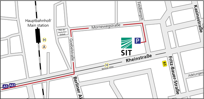 From the Frankfurt/Main airport with the Airliner from Terminal 1, bus stop no. 14, to Darmstadt main station. From there it is an approx. 10-minute walk along the Rheinstrasse. If a taxi is preferred, it is about 25 km.